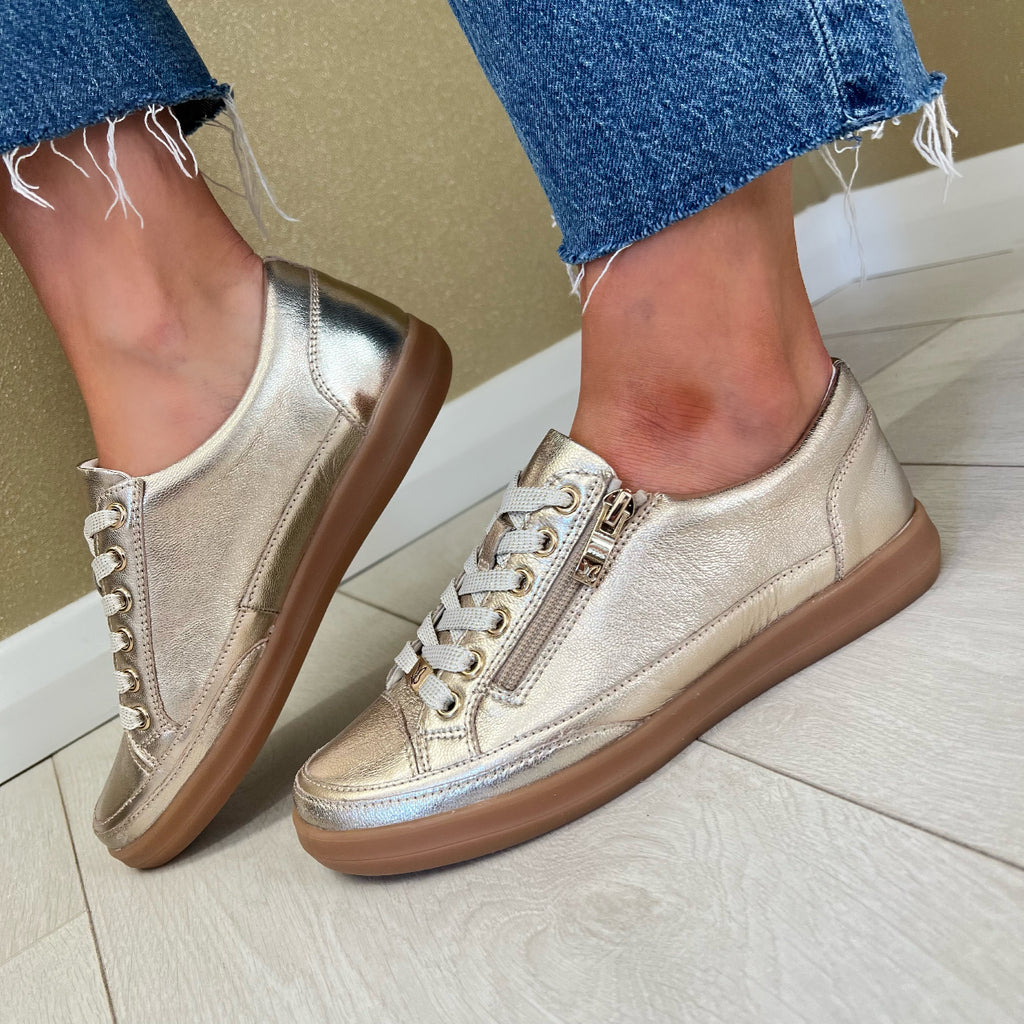 Ara Ladies Gold Metallic/Sand/Black Leather Laced/Zip Trainer 50006